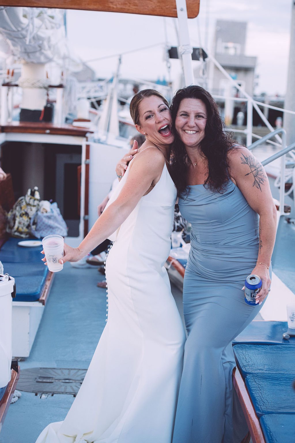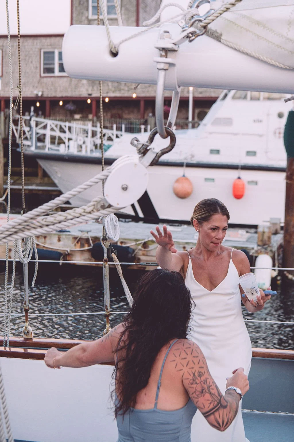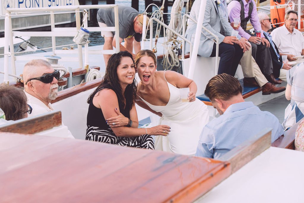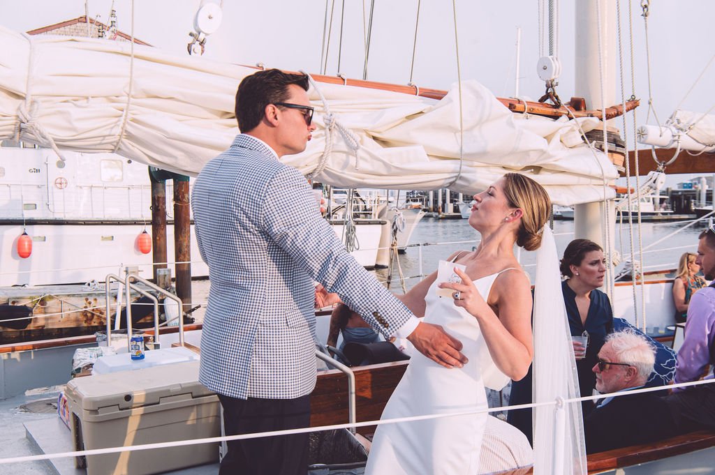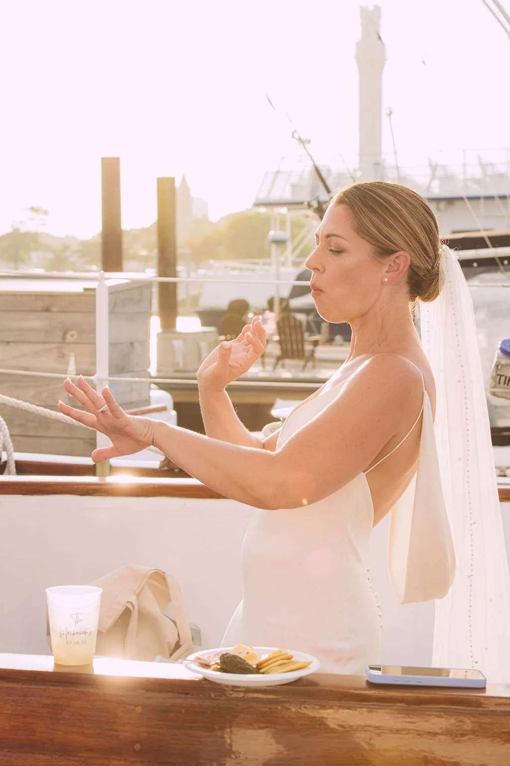 While we were all a little sad we didn’t get to watch the sunset from the water, Amanda and Christopher simply pivoted their day and made the most of it. They still shared their beautiful vows and exchanged rings right on the deck of the schooner, surrounded by their closest friends and family. Even though I was excited to capture some photos from the water, I did have more room to work with and was able to get some shots I wouldn’t have been able to otherwise. After they shared their first kiss, and were officially married, Amanda carried her phone, DJing and dancing, and we all enjoyed the sunset with food, drinks, and a whole lot of laughter.