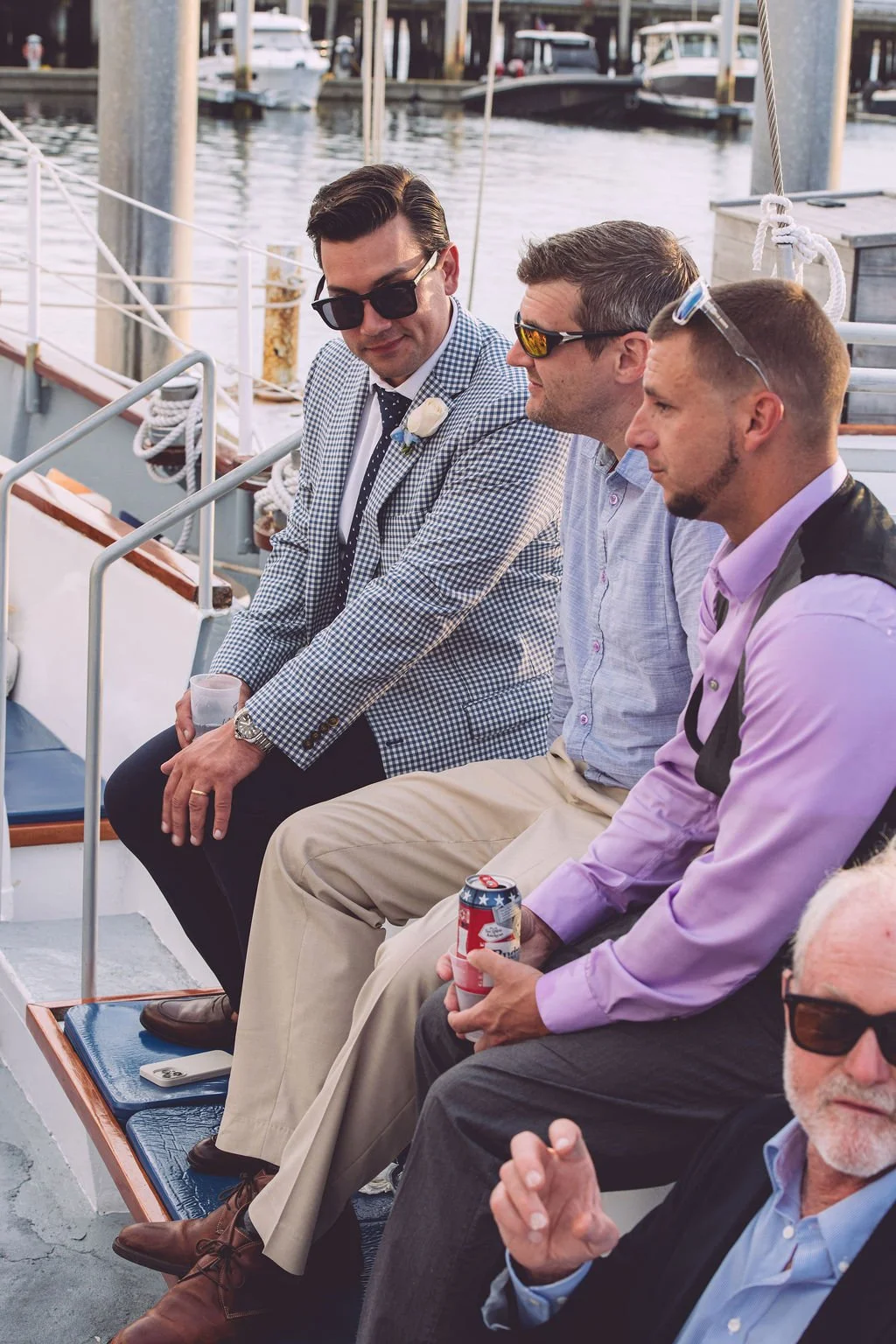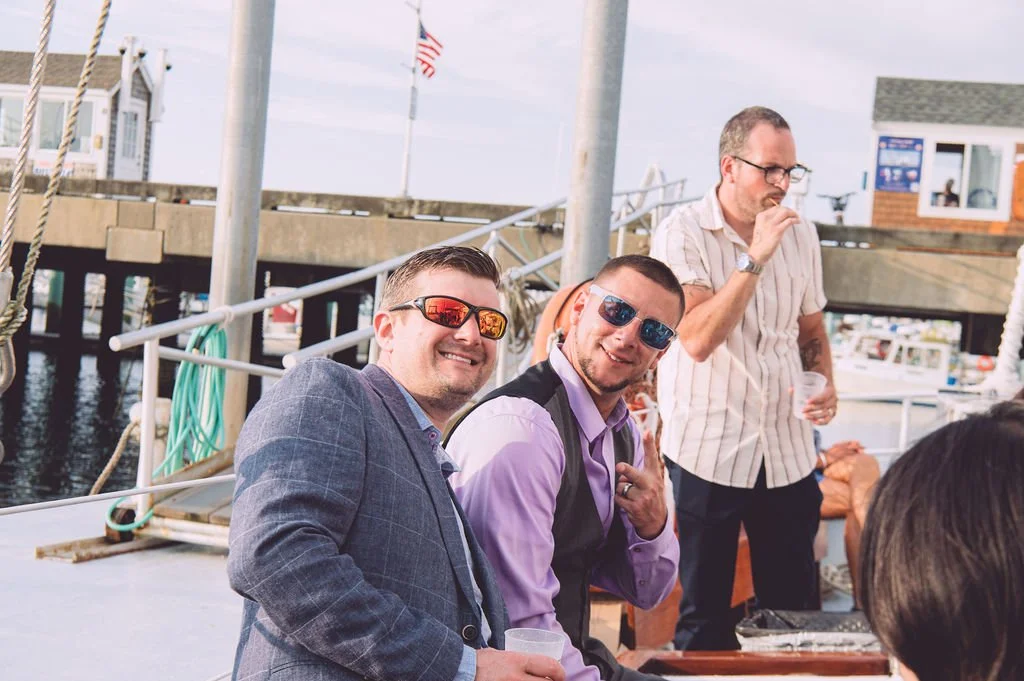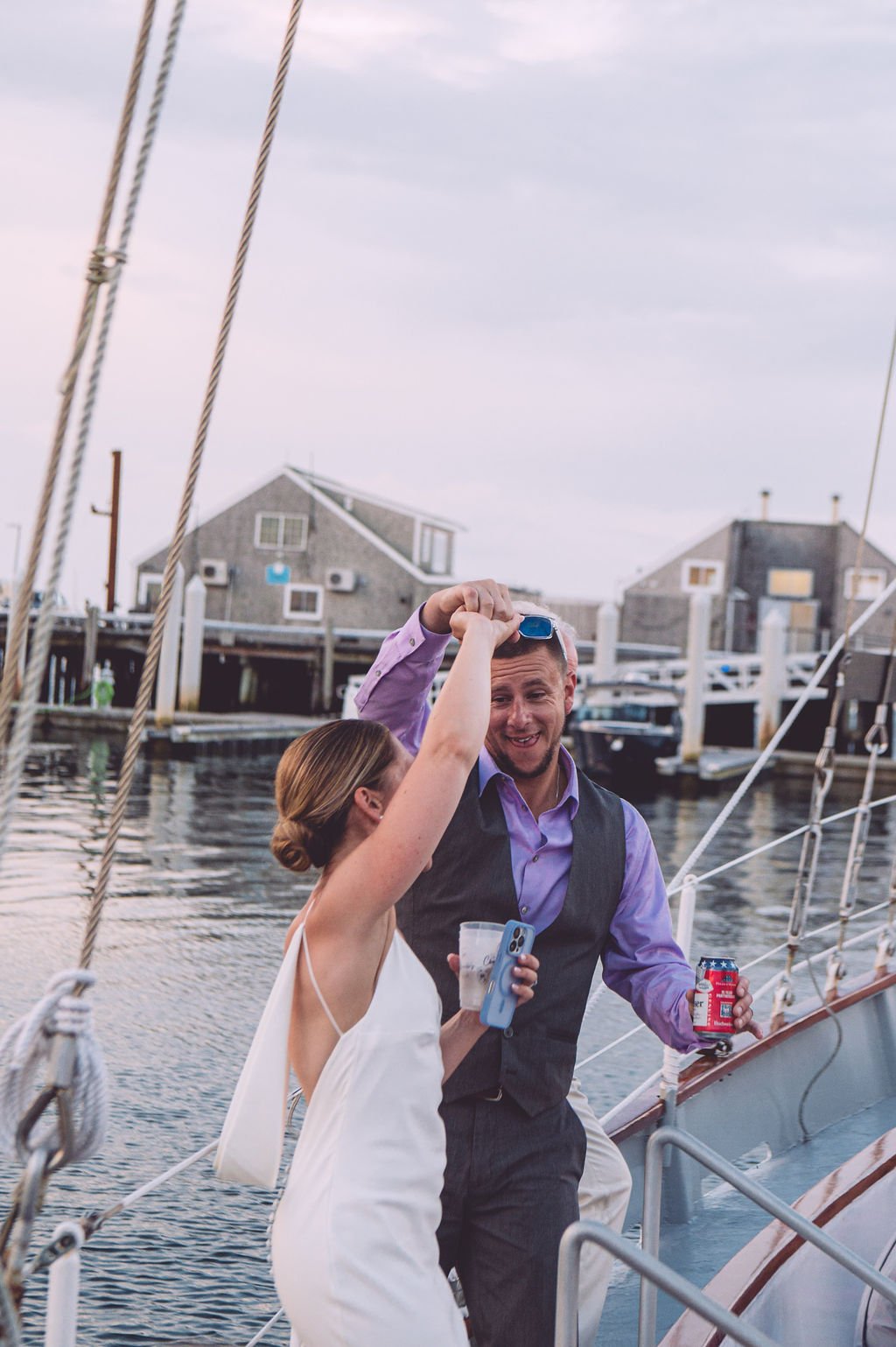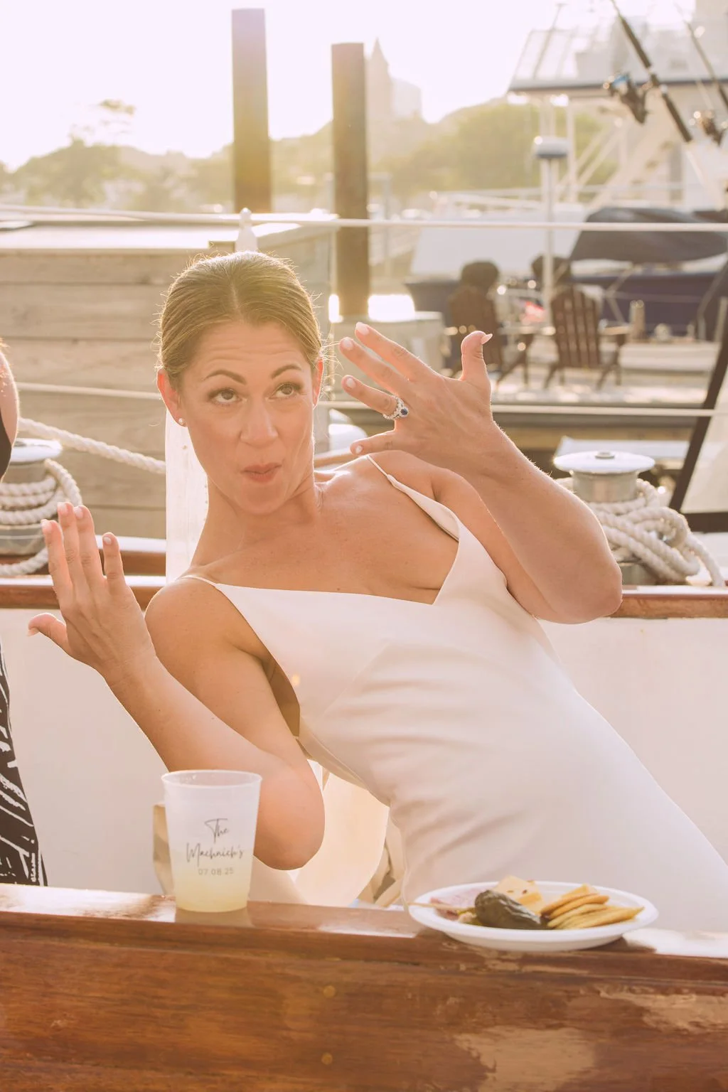 While we were all a little sad we didn’t get to watch the sunset from the water, Amanda and Christopher simply pivoted their day and made the most of it. They still shared their beautiful vows and exchanged rings right on the deck of the schooner, surrounded by their closest friends and family. Even though I was excited to capture some photos from the water, I did have more room to work with and was able to get some shots I wouldn’t have been able to otherwise. After they shared their first kiss, and were officially married, Amanda carried her phone, DJing and dancing, and we all enjoyed the sunset with food, drinks, and a whole lot of laughter.