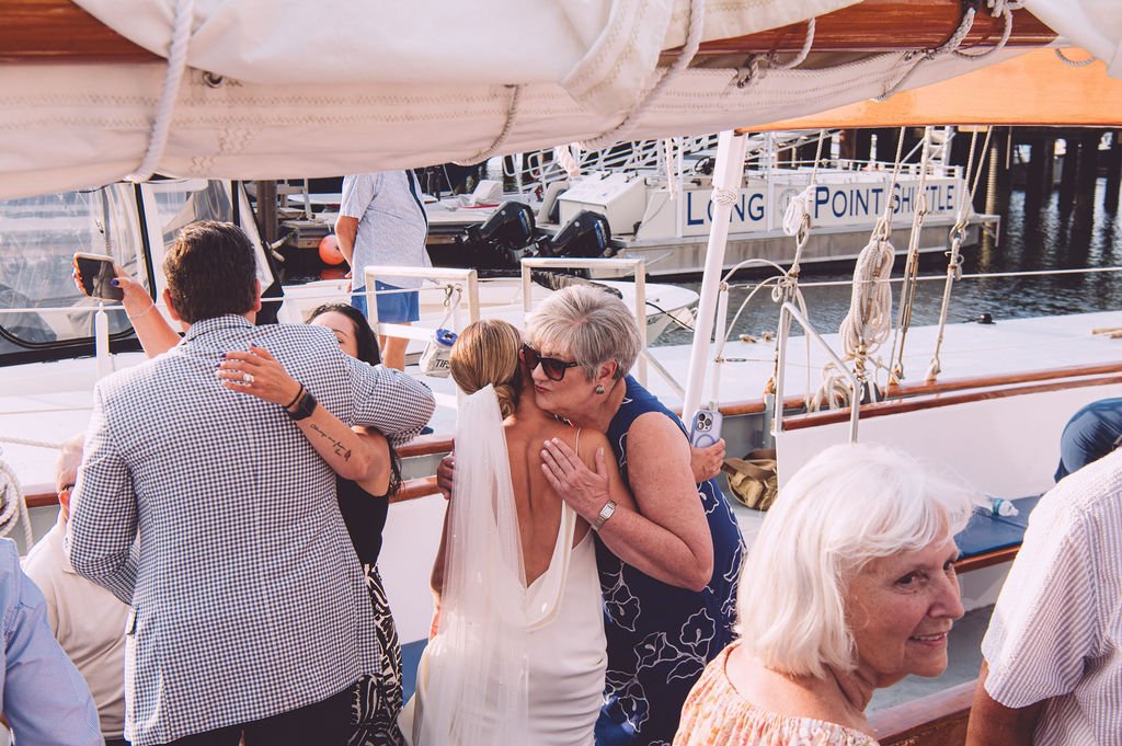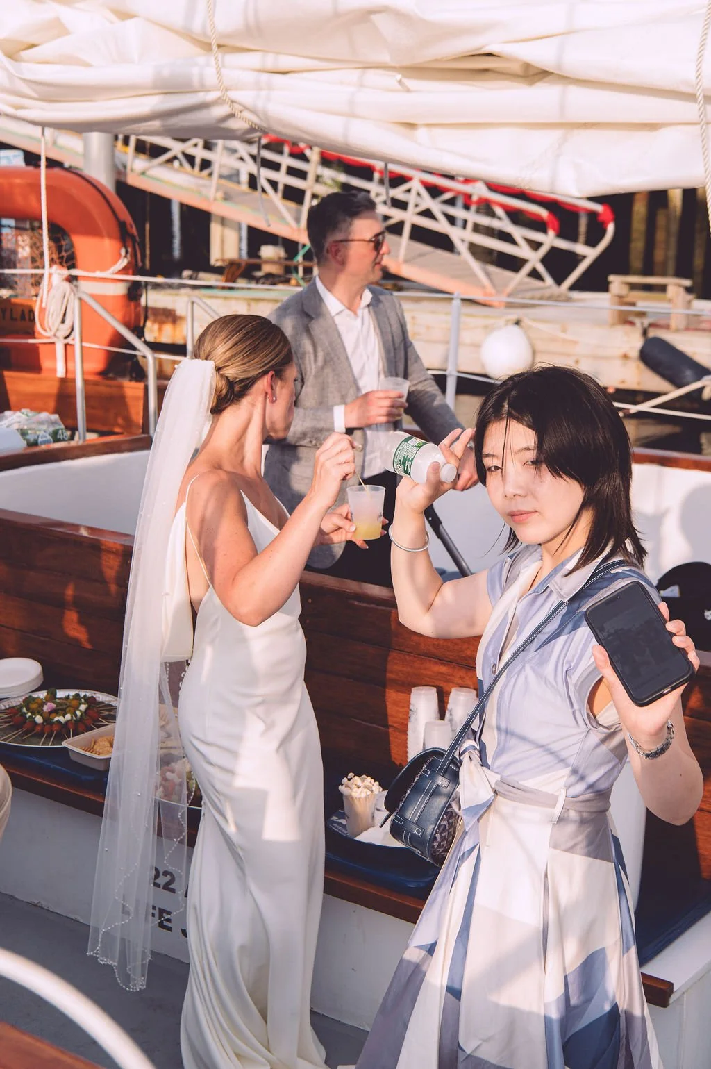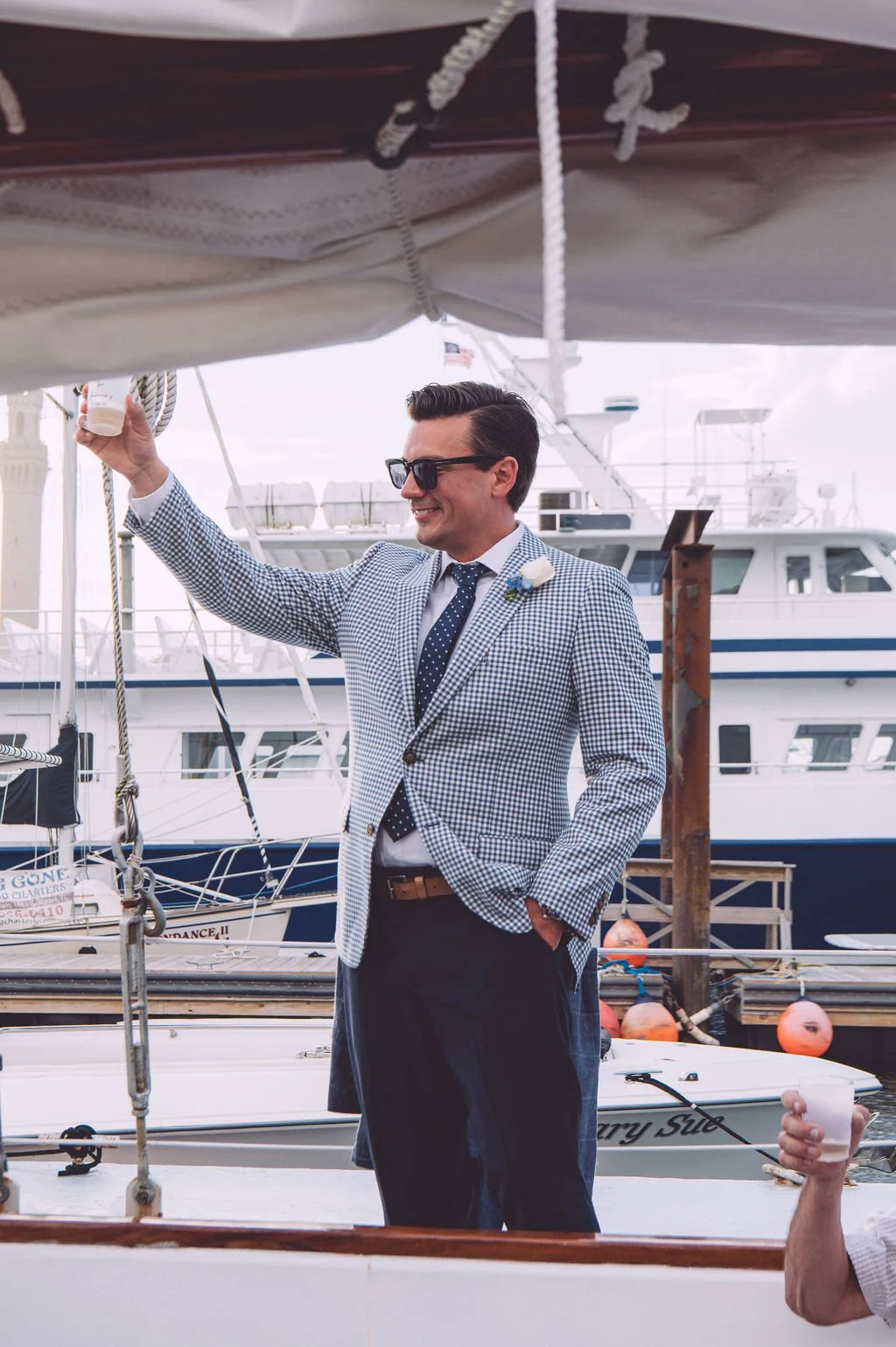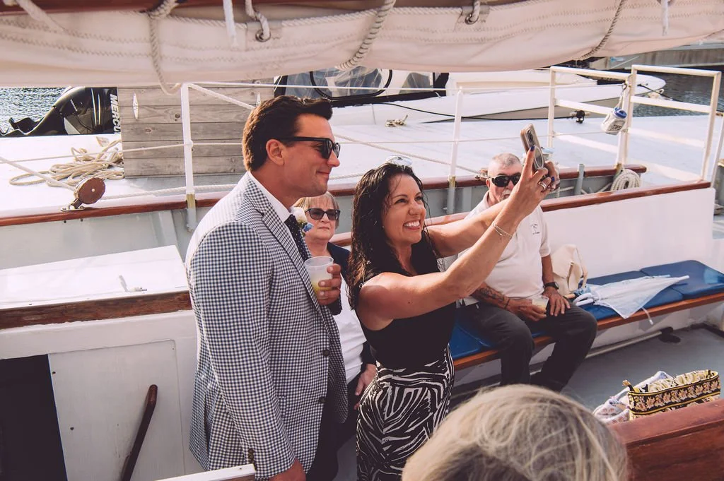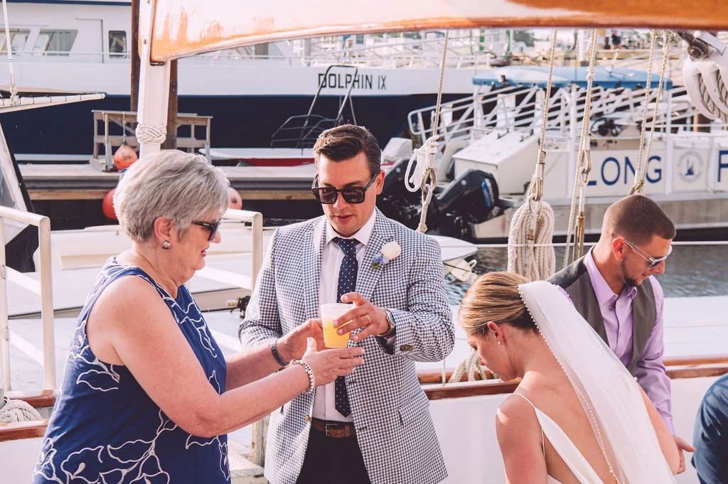 While we were all a little sad we didn’t get to watch the sunset from the water, Amanda and Christopher simply pivoted their day and made the most of it. They still shared their beautiful vows and exchanged rings right on the deck of the schooner, surrounded by their closest friends and family. Even though I was excited to capture some photos from the water, I did have more room to work with and was able to get some shots I wouldn’t have been able to otherwise. After they shared their first kiss, and were officially married, Amanda carried her phone, DJing and dancing, and we all enjoyed the sunset with food, drinks, and a whole lot of laughter.