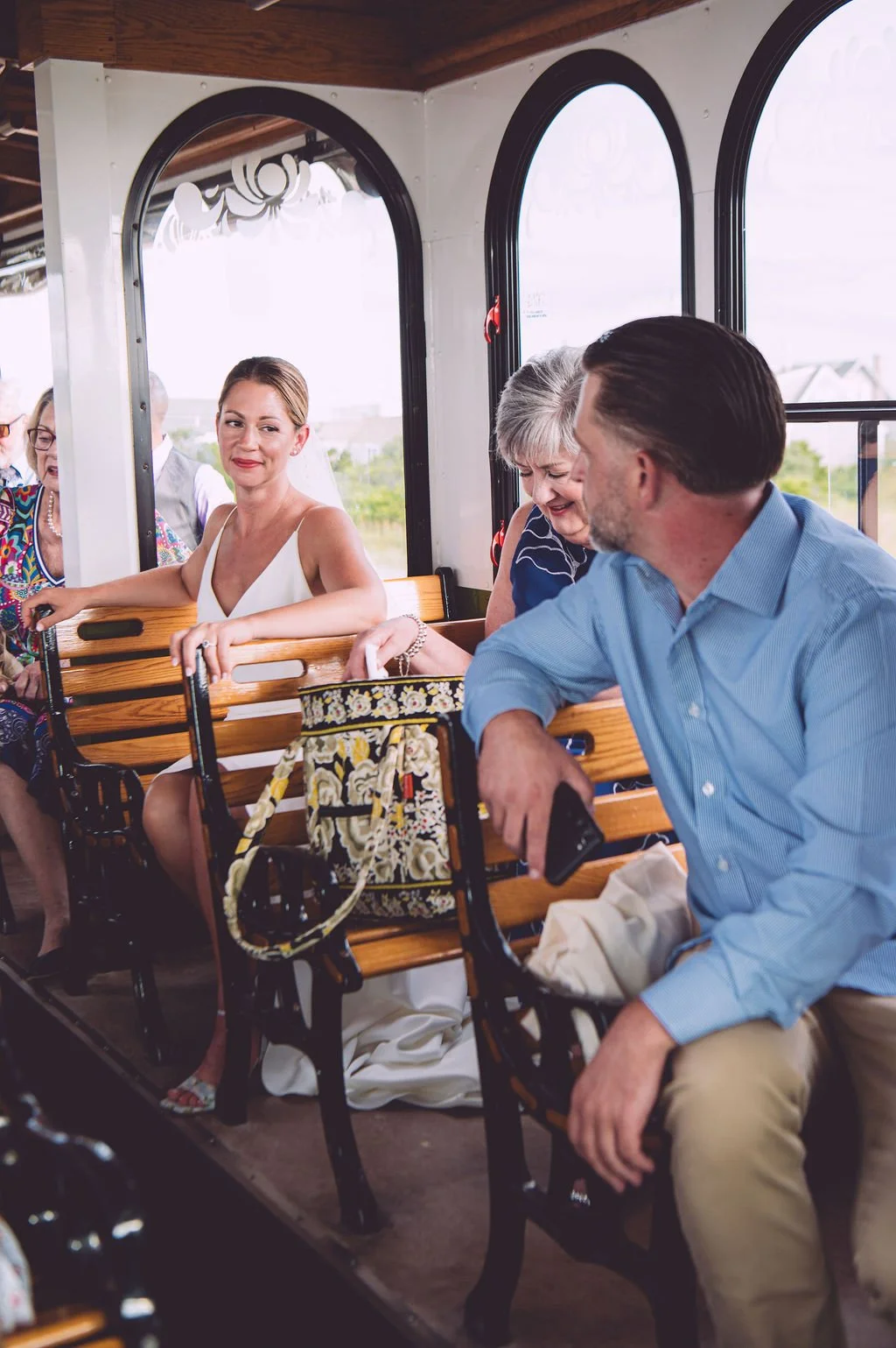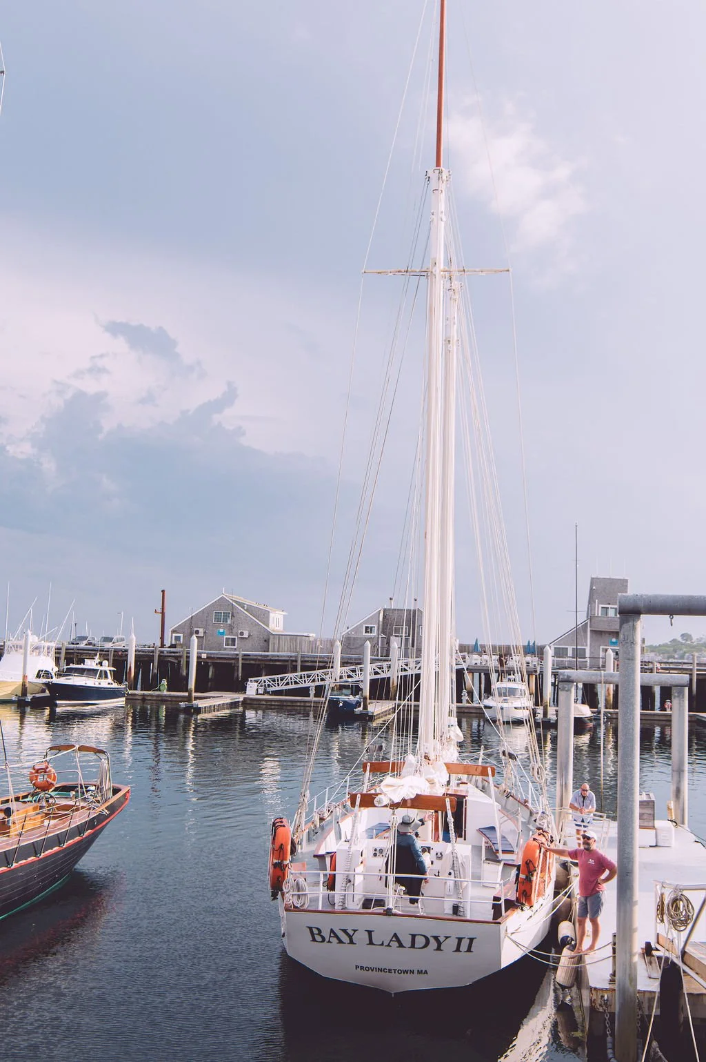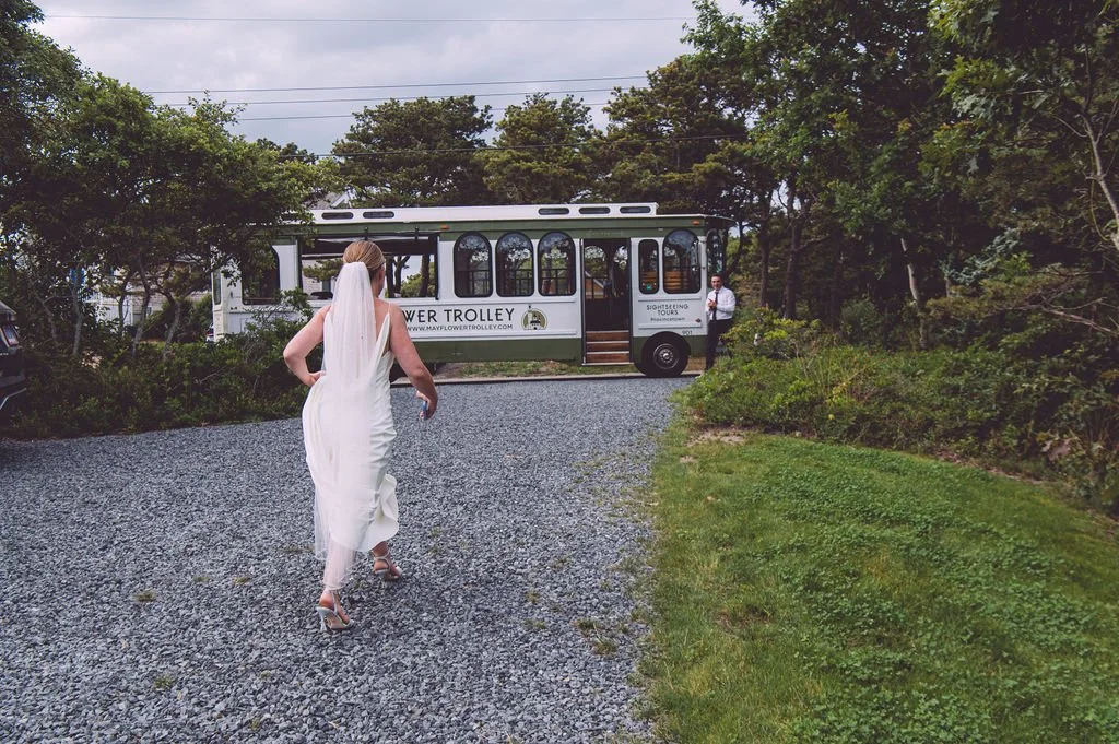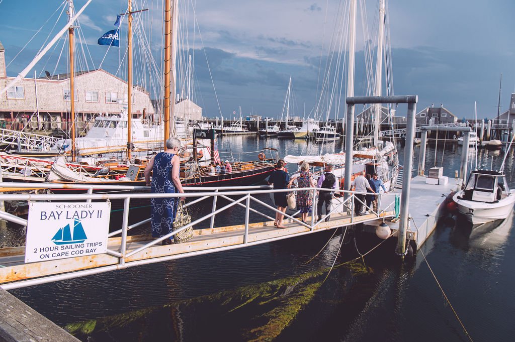 Ultimately, the questionable weather reports and shifting forecasts meant the Schooner Bay Lady II did not set sail, however, we were still able to hold the wedding on the deck, we just stayed docked in the marina for safety. We did have a newborn with us after all. From the AirBNB, we had a fun a ride from the Mayflower Trolley to the marina in Provincetown.
